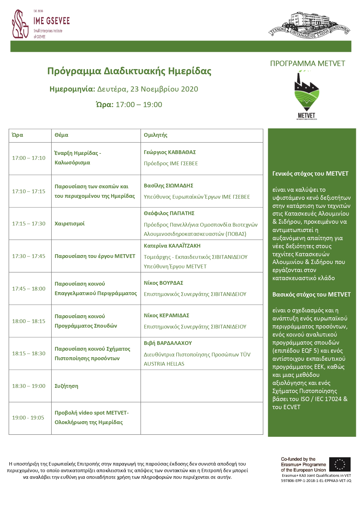 Η ΠΟΒΑΣ συμμετείχε ενεργά σε Διαδικτυακή Ημερίδα του έργου Erasmus+ με τίτλο: «Διακρατική  Ανώτερη Επαγγελματική Εκπαίδευση και Κατάρτιση στον Τομέα του Μετάλλου– METVET», η οποία  διοργανώθηκε τη Δευτέρα 23/11/2020 από τη Σιβιτανίδειο Δημόσια Σχολή Τεχνών και  Επαγγελμάτων και το ΙΜΕ ΓΣΕΒΕΕ.