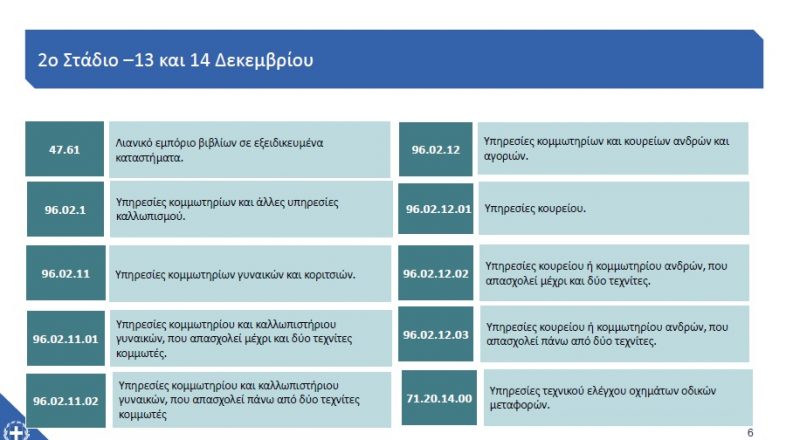 Όπως ανακοίνωσε η κυβέρνηση οι ΚΑΔ των επιχειρήσεων που θα λειτουργήσουν από τη Δευτέρα 14 Δεκεμβρίου 2020 έχουν ως εξής: