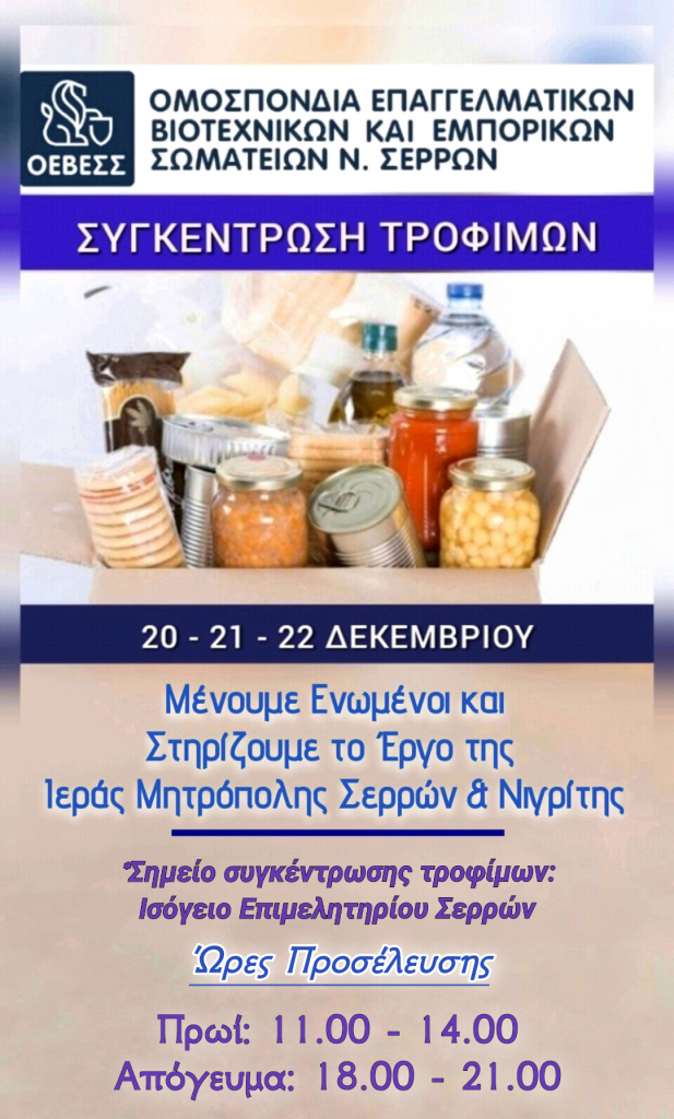 Η συγκέντρωση τροφίμων θα πραγματοποιηθεί στις 20 – 21 και 22 Δεκεμβρίου στο ισόγειο του Επιμελητηρίου των Σερρών, πρωινές και απογευματινές ώρες, 11.00 – 2.00πμ και 18.00 – 21.00