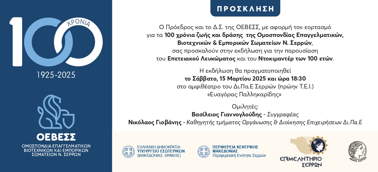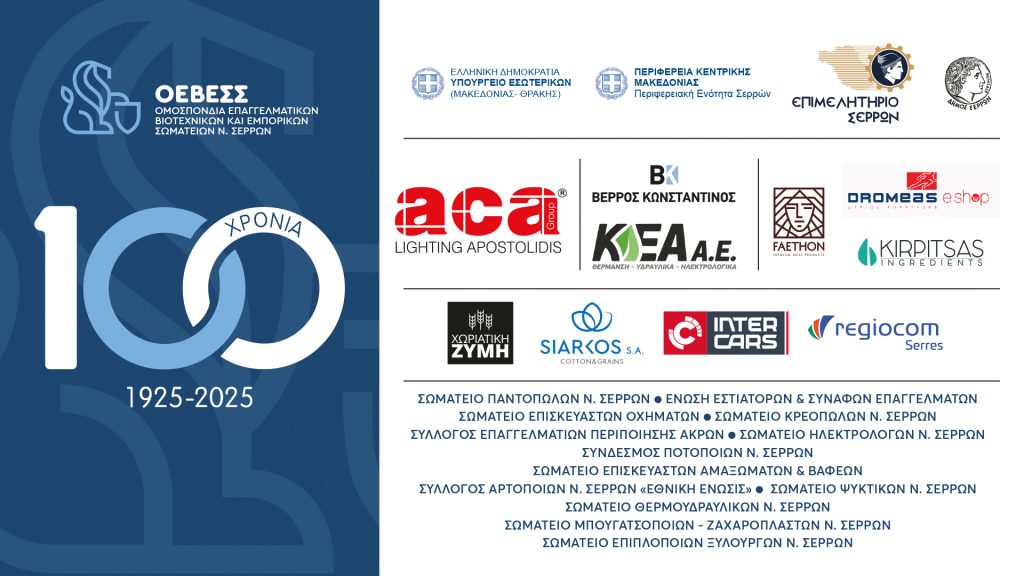 100 χρόνια αγώνων, διεκδικήσεων και συνεχούς συνδικαλιστικής δράσης συμπληρώνει φέτος, το 2025, η Ομοσπονδία Επαγγελματικών, Βιοτεχνικών & Εμπορικών Σωματείων Ν. Σερρών (ΟΕΒΕΣΣ), που πρωτοϊδρύθηκε τον Ιούλιο του 1925 και έκτοτε με τη δράση της άφησε στο Νομό Σερρών ένα στίγμα ανεξίτηλο που καθόρισε αποφασιστικά τη διαμόρφωση του τοπικού, επαγγελματικού γίγνεσθαι.