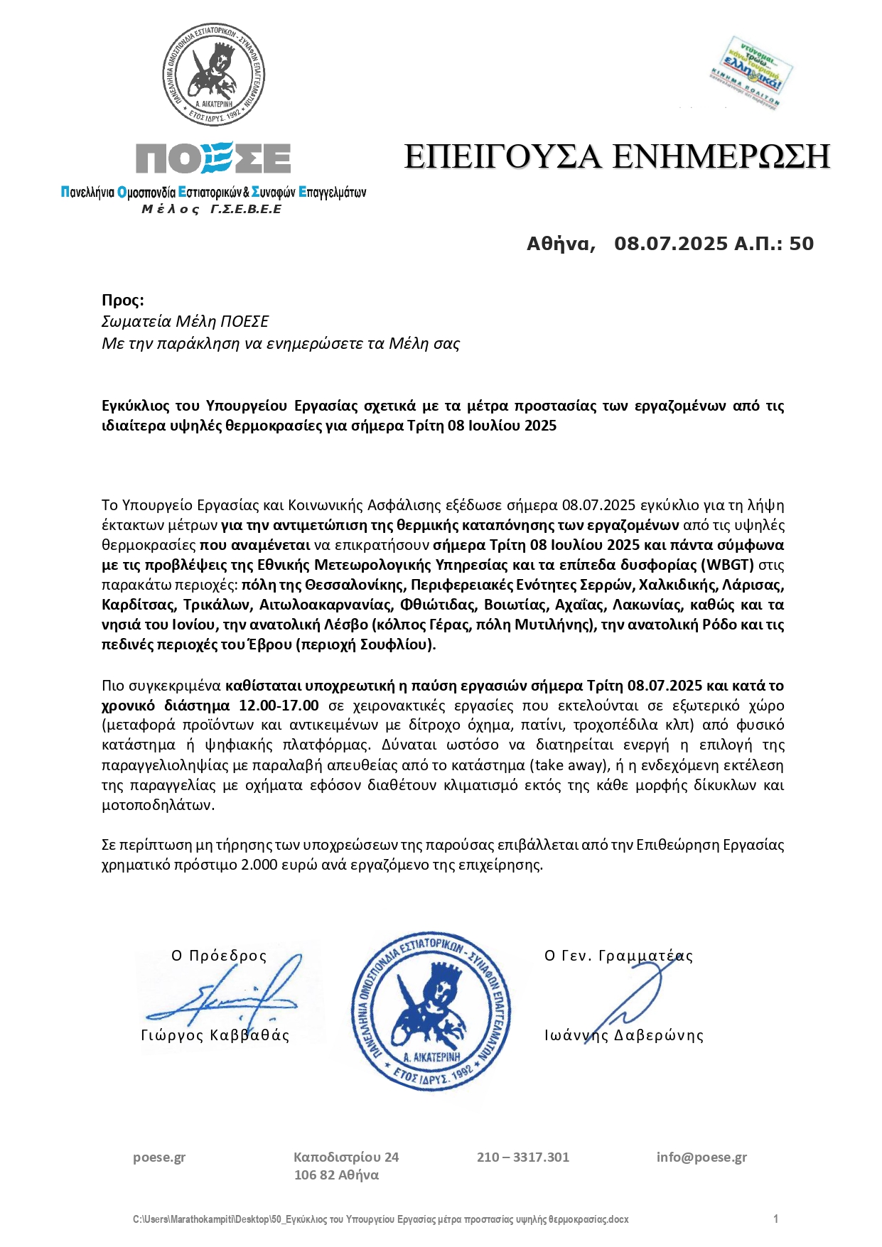 «Για την προστασία των εργαζομένων στους νομούς που το φαινόμενο θα είναι έντονο, από τις 12:00 -17:00 ΑΠΑΓΟΡΕΥΟΥΜΕ κάθε είδους εξωτερική εργασία και ειδικά τις υπηρεσίες delivery. Κατά τις ώρες αυτές ΑΠΑΓΟΡΕΥΕΤΑΙ οι σχετικές ηλεκτρονικές πλατφόρμες να δέχονται παραγγελίες για παράδοση. Οι έλεγχοι θα είναι συνεχείς και τα πρόστιμα πολύ υψηλά. Την Υγεία και την Ασφάλεια των εργαζομένων την θεωρούμε την απόλυτή μας προτεραιότητα. Εάν τηρηθούν τα μέτρα όλα θα πάνε καλά και άλλη μία δύσκολη μέρα θα περάσει».