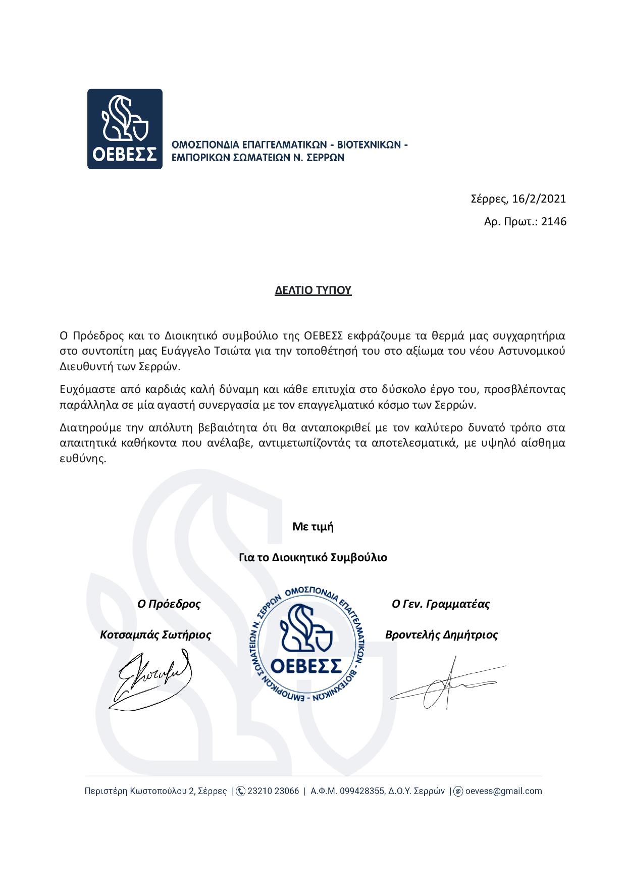 Τους εκπροσώπους της Ένωσης Καταστημάτων Αναψυχής & Εστίασης Ν. Σερρών υποδέχτηκε σήμερα (22/12/2021) το πρωί ο Αστυνομικός Διευθυντής των Σερρών Ευάγγελος Τσιώτας.