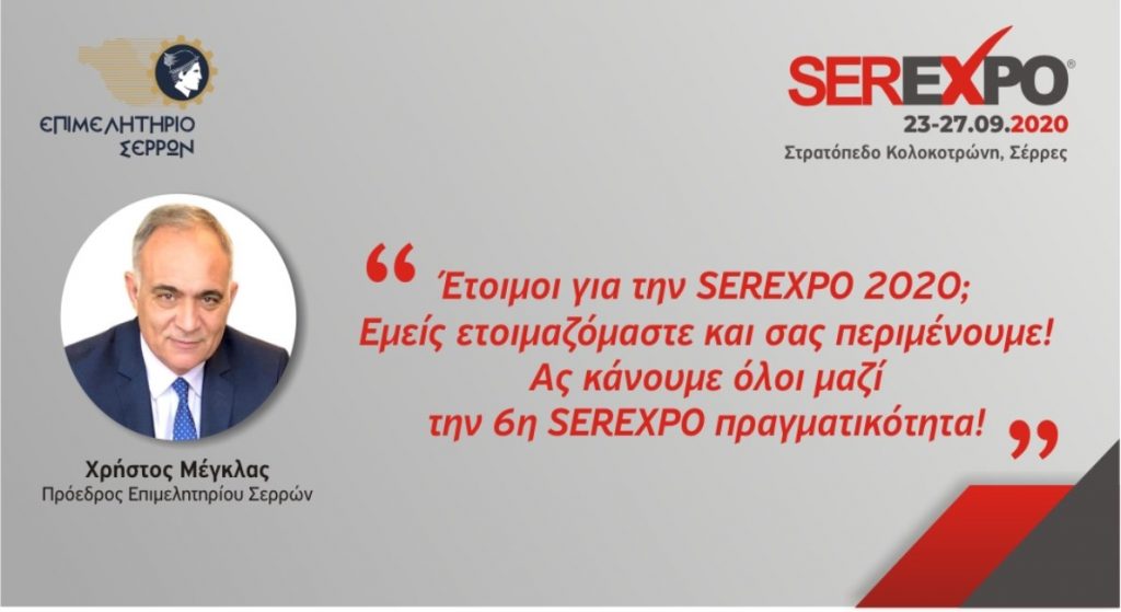“Με αίσθημα ευθύνης και κύριο μέλημά μας την προστασία της δημόσιας υγείας αποφασίστηκε η αναβολή της 6ης SEREXPO, που θα πραγματοποιούνταν από το Επιμελητήριο Σερρών σε συνδιοργάνωση με την Π.Ε. Σερρών από τις 23 έως και τις 27 Σεπτεμβρίου 2020.